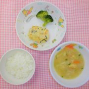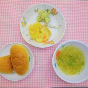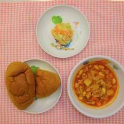 ロールパン マカロニグラタン 粉ふき芋 コンソメスープ 小魚