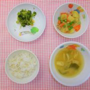 麦ごはん カレー肉じゃが ブロッコリーのごまあえ みそ汁 小魚