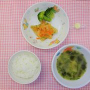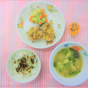 ふりかけごはん 鶏肉の唐揚げ ゆで野菜サラダ みそ汁 ゼリー