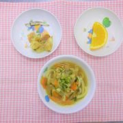 かやくうどん じゃがいもの和風ツナマヨ焼き 果物(オレンジ) 小魚
