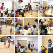 今年度最後の生け花教室でした。 今日のためにひなまつりの花瓶を制作し、みんなが桃の花と好きな花を選んで生けました。 先生が子ども達に「選んでもらったお花の気持ち····