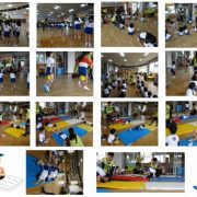 ≪体育遊び教室≫ 大阪体育大学の先生と学生さん達が体育遊び教室を開いてくれます。 学生さん達と一緒に準備体操と柔軟体操をします。 今日のプログラムはマット運動····