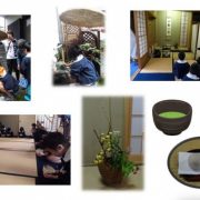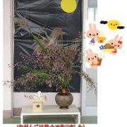 『お茶教室』(5歳児)が始まりました。 ・床の間には茶器が置かれ、宗全籠(花器)には秋の草花(白秋明菊、白藤袴、ほととぎす、すすき、秋海棠)が飾られていました····